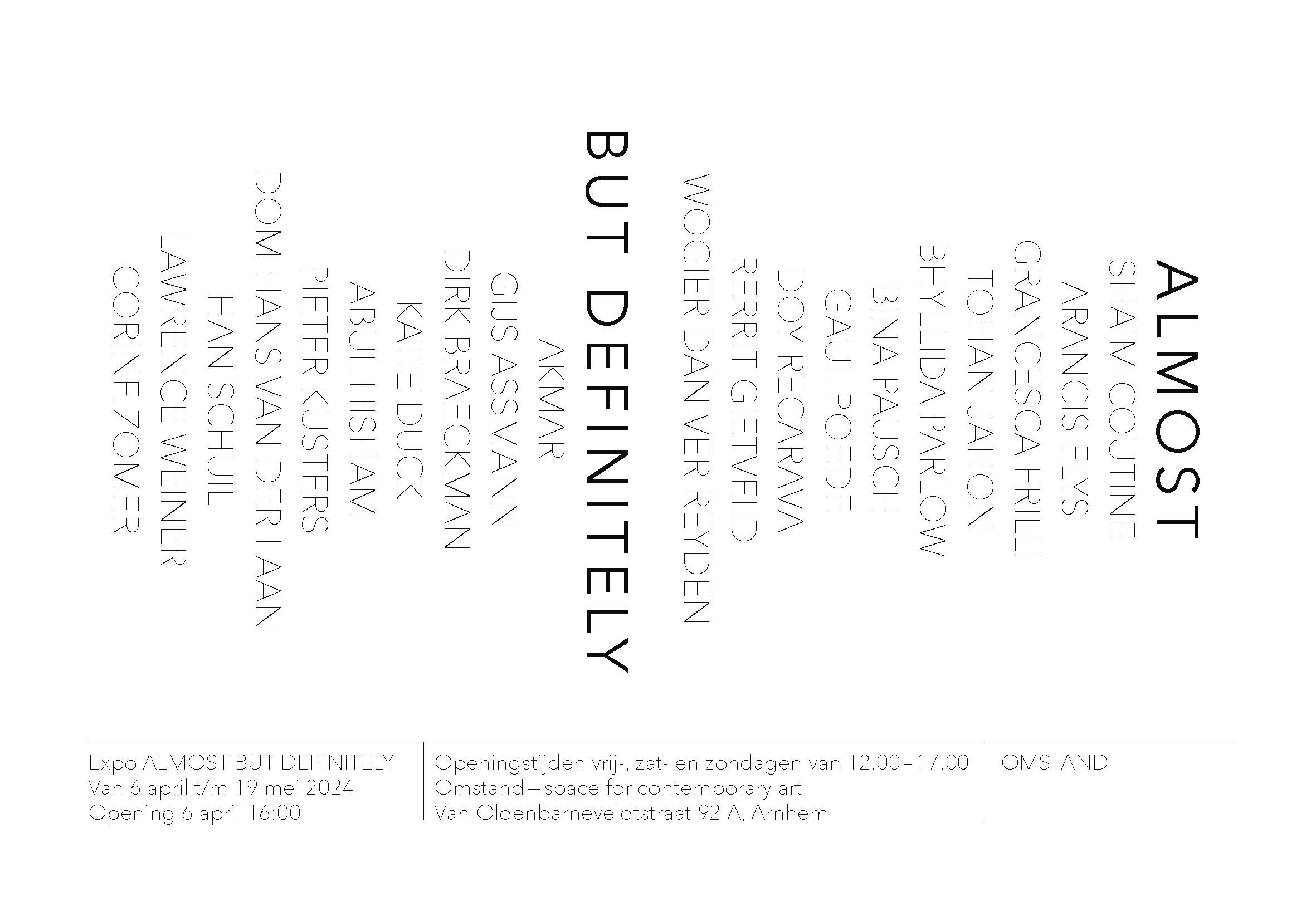 De tentoonstelling ALMOST, BUT DEFINITELY is te zien van 6 april t/m 19 mei 2024 te zien in OMSTAND – space for contemporary art, Arnhem